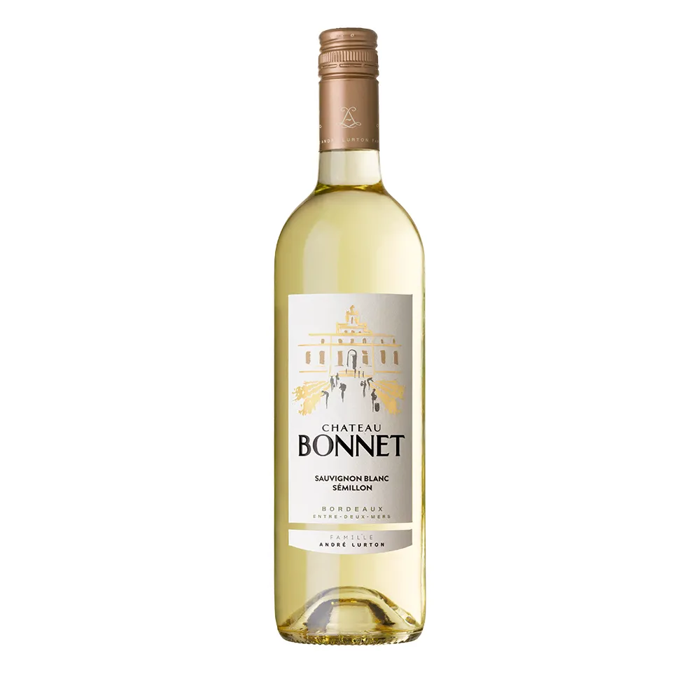 Château Bonnet in the Entre-deux-Mers is the historic home of the André Lurton family and a reference for crisp, aromatic white Bordeaux. The blend brings together Sauvignon Blanc, Sémillon and Muscadelle from cool hillside vineyards on clay-limestone soils. Fermentation in temperature-controlled stainless-steel tanks is followed by a short period on the lees to add texture. The bouquet offers lemon, grapefruit and green apple with gooseberry, white flowers and a touch of exotic fruit. On the palate Château Bonnet Entre-deux-Mers blanc is bright, zesty and refreshing, with lively acidity and a lightly mineral finish – perfect as an aperitif or with seafood, grilled fish and light summer dishes.