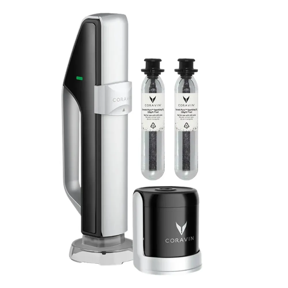 | The Coravin Sparkling Wine Preservation System is built for anyone who wants bubbly on their own schedule. Open the bottle, pour a glass, then reseal it immediately with the Sparkling Stopper. The Charger restores pressure by injecting pure CO₂, helping keep effervescence lively. A clear pressure indicator lets you know when the bottle is fully charged and ready. Done right, freshness, aroma and sparkle can be preserved for up to four weeks. The set includes the Charger, a Sparkling Stopper, CO₂ capsules and a protective bottle sleeve. Perfect for Champagne, Prosecco, Cava and any occasion where choice matters more than finishing the bottle. | |