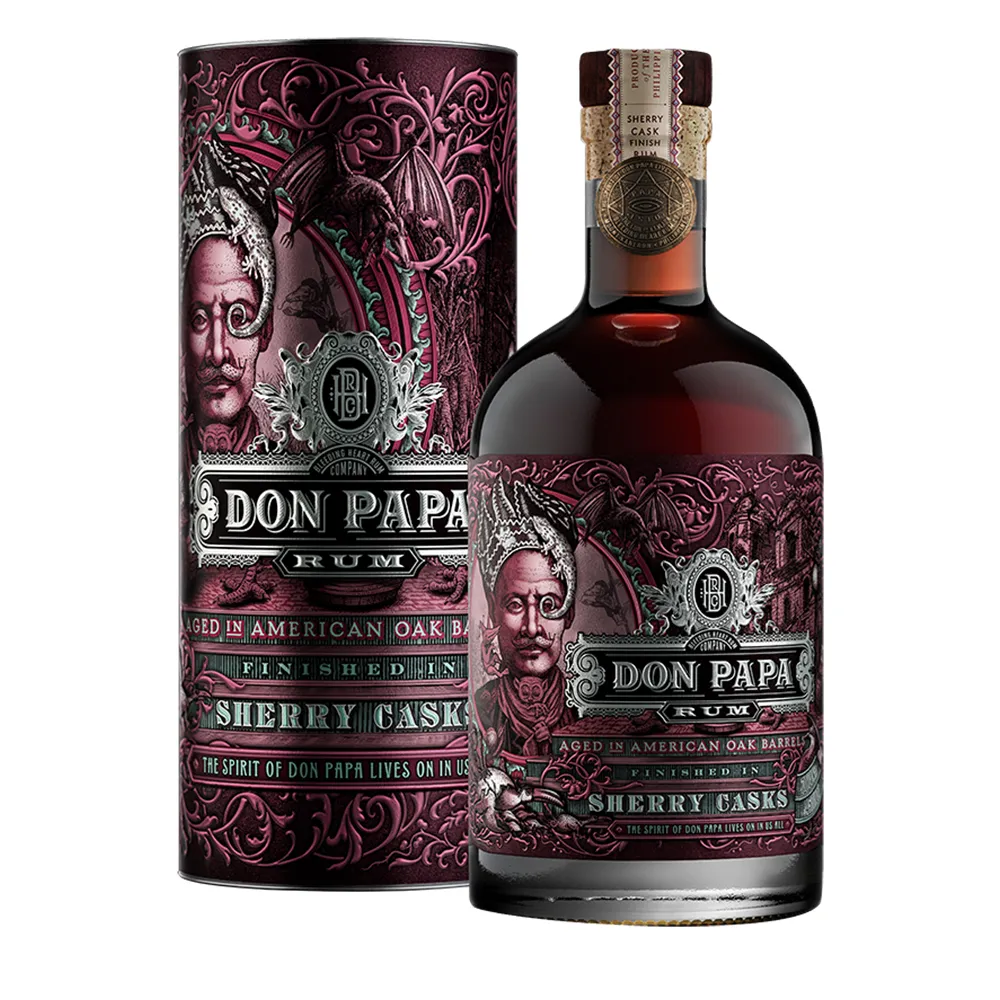 | Don Papa Sherry Cask begins its life in ex-bourbon American oak before being finished in four different sherry casks, including Palo Cortado, Fino, Cream and Pedro Ximénez. The result is a deeply coloured rum with a dry, almost nutty nose and a rich, fruit-driven palate. Aromas of candied tropical fruit, plums, raisins, dark chocolate and oak lead into flavours of sweet plum, cocoa, dates and dark berries. A silky texture and caramel notes carry through to a smooth, fruity finish. This is a decadent sipping rum for sherry and whisky lovers alike. Best enjoyed slowly in a wide glass to let the sherry complexity unfold. | |