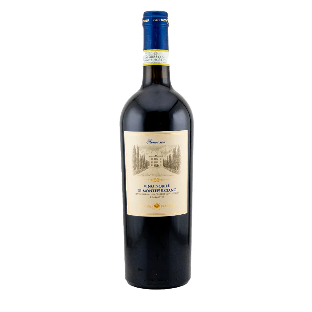 Fattoria del Cerro’s Vino Nobile di Montepulciano comes from hillside vineyards around Acquaviva di Montepulciano and is based mainly on Prugnolo Gentile, the local Sangiovese clone. The bouquet opens with ripe cherry, dark berries and hints of plum, supported by violet, gentle toast and sweet spice. On the palate the wine is concentrated yet elegant, showing juicy fruit, well-integrated acidity and a firm but balanced tannic frame. Maturation in oak adds depth and subtle notes of vanilla and leather. The long, harmonious finish echoes spice and dark fruit. A classic Vino Nobile that pairs beautifully with stuffed pasta, braised dishes, game and mature hard cheeses.