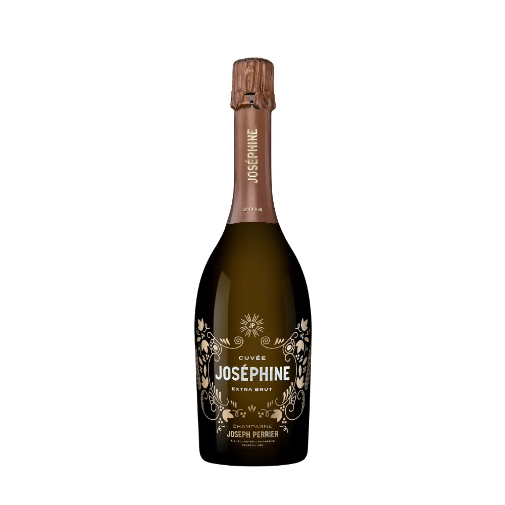 Champagne Brut Cuvée Josephine by Joseph Perrier is the house prestige cuvée, marrying generous depth with refined elegance. In the glass it shines golden with copper tints and a fine, persistent bead. The bouquet reveals white flowers, ripe pear, pale stone fruit and aromas of toasted hazelnut, brioche and delicate spice. On the palate the Champagne is silky, layered and powerful, carried by precise acidity and chalky minerality. The structure is dense yet weightless, giving a dancing, airy impression. The finish is very long, noble and complex. A great celebration Champagne for fine fish, shellfish, refined poultry dishes and elaborate menus.