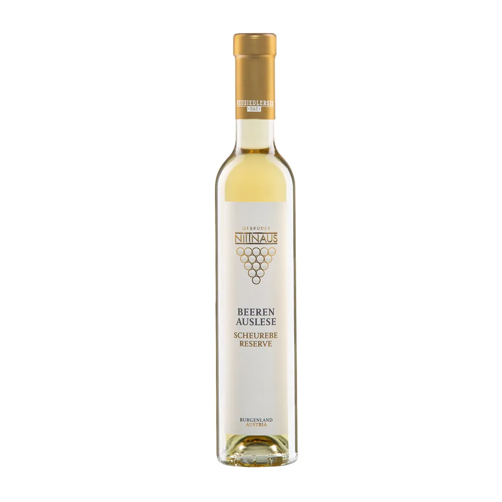 | Beerenauslese Scheurebe Reserve from Gebrüder Nittnaus comes from the Neusiedlersee region, where warm days and cool nights favour noble‑sweet wines. In the glass it shows a pale golden colour with pronounced viscosity. The nose is intensely aromatic, offering ripe pineapple, passion fruit and yellow stone fruit alongside citrus and floral notes. On the palate the wine is rich, juicy and multi‑layered, combining bright, pure sweetness with lively acidity that keeps everything in balance. The texture is creamy yet focused, underpinned by fine minerality. A refined dessert wine with a very long finish of tropical fruit and apricot, perfect with fruit‑based desserts, cheese or simply enjoyed on its own. | |